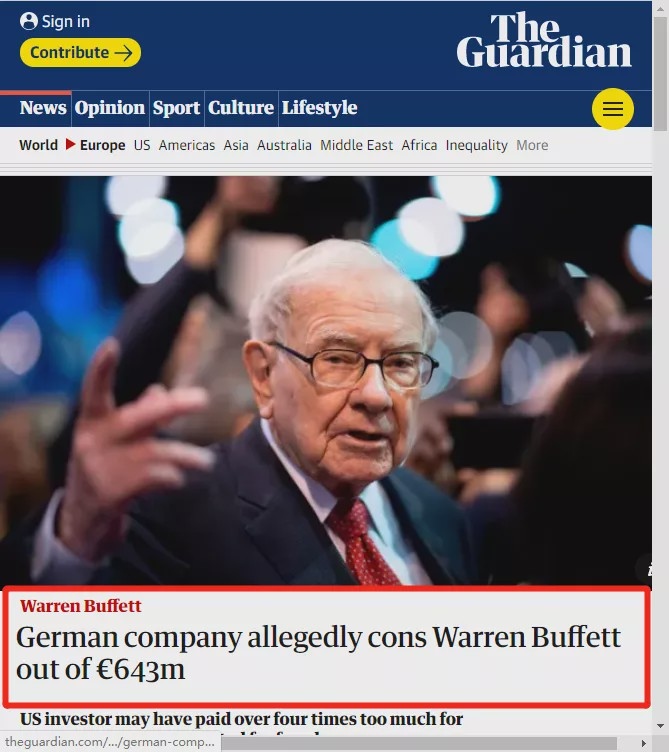 德国《商报》2017年对巴菲特收买该公司的报导