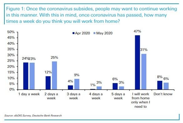 德银向全球450名专业投资者发布问卷,收集他们关于新冠疫情及商场走势观点。多个方面数据显现,57%的组织投资者以为,后疫情年代在家工作将变得更惯例,每周或许要有1-3天的时刻在家工作。