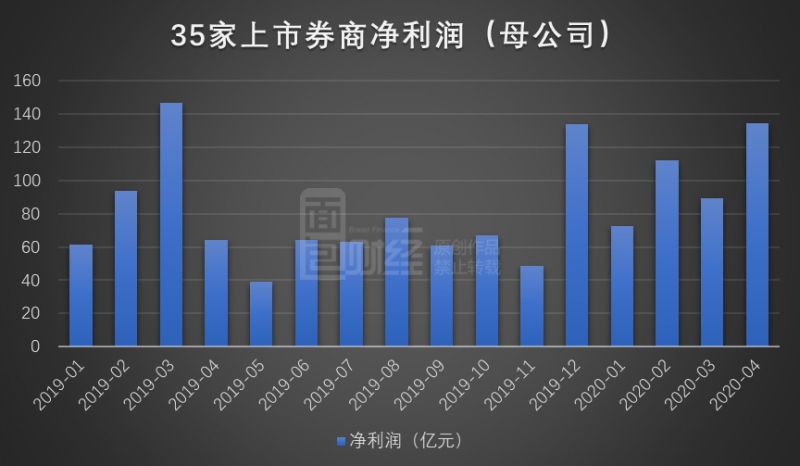 母公司口径下,2020年4月35家上市券商算计完成净赢利134.26亿元,同比添加109.03%,环比添加50.14%。其间30家同比呈现添加,4家下降,1家扭亏为盈。