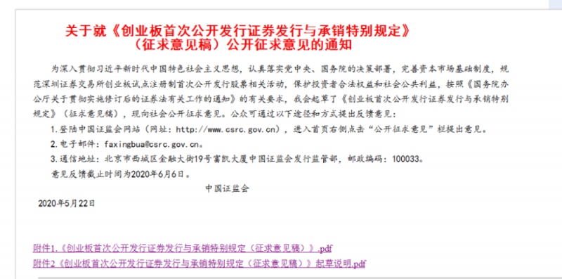 5月22日晚间,为做好创业板变革并试点注册制作业,我国证监会在总结近年来新股发行承销准则变革,尤其是科创板试点注册制变革实践经验的基础上,结合创业板特色,就创业板初次揭露发行证券发行与承销特别规则揭露征求意见。