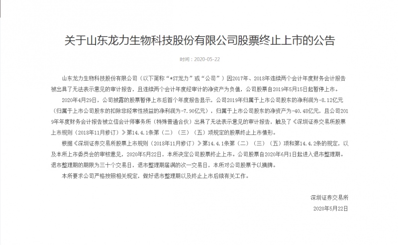 5月22日晚间,深交所发布关于山东龙力生物科技股份有限公司股票停止上市的布告。依据布告,2020年5月22日,深圳证券交易所决议公司股票停止上市。公司股票自2020年6月1日起进入退市收拾期。退市收拾期的期限为三十个交易日,退市收拾期届满的次一交易日,深交所对公司股票予以摘牌。