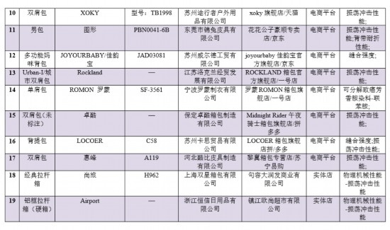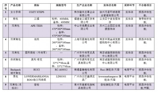 背提包方面,抽查共发现17批次产品不合格,其中14批次产品振荡冲击性能不合格,缝制质量较差,在使用过程中容易出现提把同包体断裂,部件开线、脱落、断裂现象;2批次产品缝合强度不合格,缝口易开线撕裂;2个批次产品背带耐折性能不合格,表面涂层易开裂;1个批次产品甲醛项目不合格,1批次产品可分解芳香胺染料不合格。