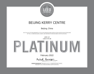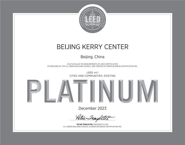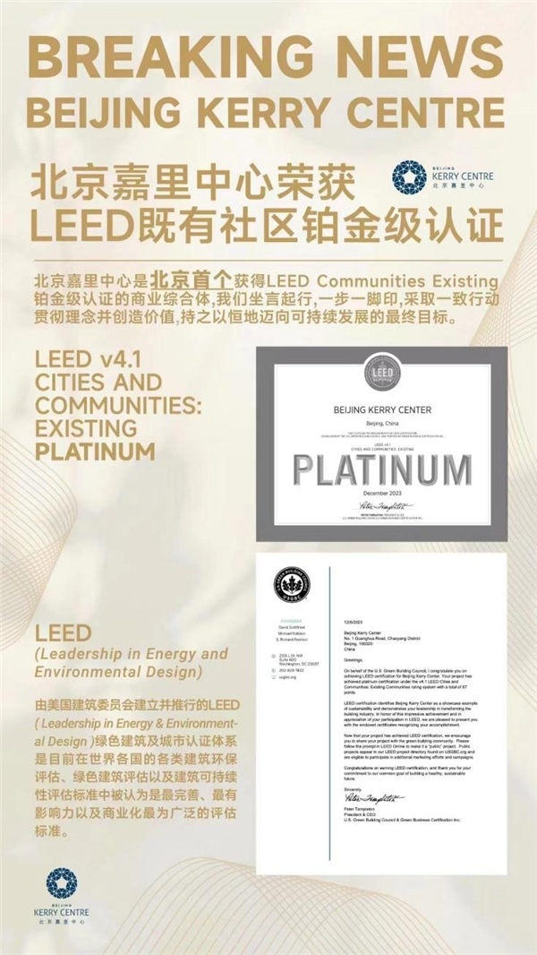 「 LEED城市和社区认证」 代表着具有韧性、绿色、包容和智慧的社区新发展方向。它提供了一种在全球范围内一致衡量和传达绩效的方式。该评价体系涵盖了城市和社区的可持续性:生活质量、健康、繁荣、公平、教育、韧性、基础设施和能源,有助于城市和社区展示对居民的承诺。获得LEED既有社区铂金级认证是对北京嘉里中心打造更美好社区所做的努力的认可,也是对嘉里可持续发展承诺的认可,证明了嘉里对打造绿色、健康、智慧、包容城市的坚定决心。北京嘉里中心将不懈努力,持续改善,致力于打造一个更加宜居、繁荣和可持续的社区。