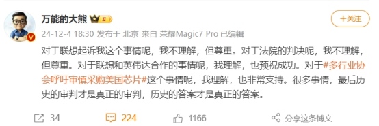 判决宣布后,“万能的大熊”随即发布微博“阴阳”法院的判决——“对于联想起诉我这个事情呢,我不理解,但尊重。对于法院的判决呢,我不理解,但尊重。对于联想和英伟达合作的事情呢,我理解,也预祝成功。对于#多行业协会呼吁审慎采购美国芯片#这个事情呢,我理解,也非常支持。很多事情,最后历史的审判才是真正的审判,历史的答案才是真正的答案”。 ——发布于北京,来自荣耀Magic7 Pro。
